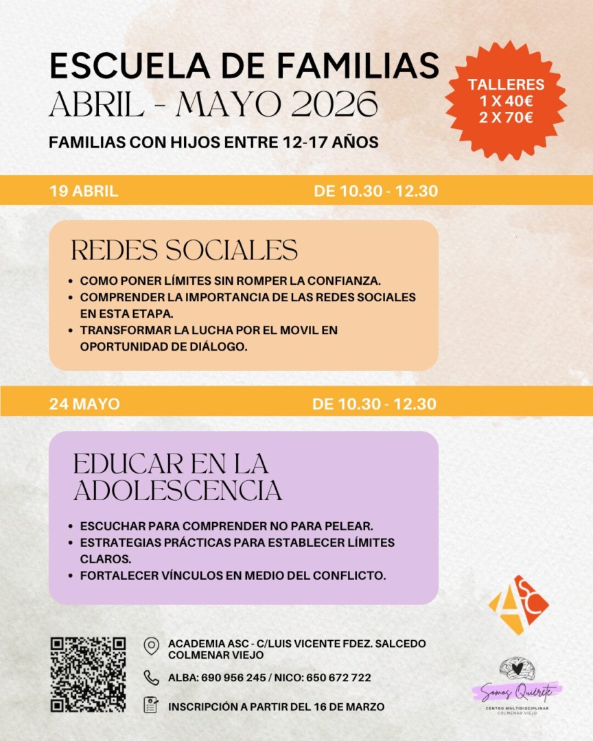 Todos los talleres de la Escuela de Padres se realizarán en Academia ASC (Al Salir del Cole), en Colmenar Viejo, un espacio cercano y cómodo pensado para el encuentro y el aprendizaje entre familias.
